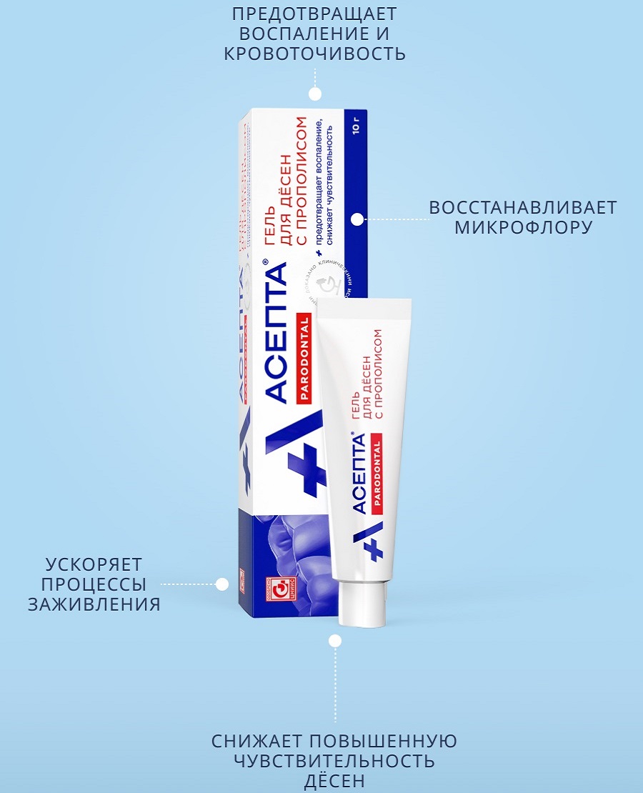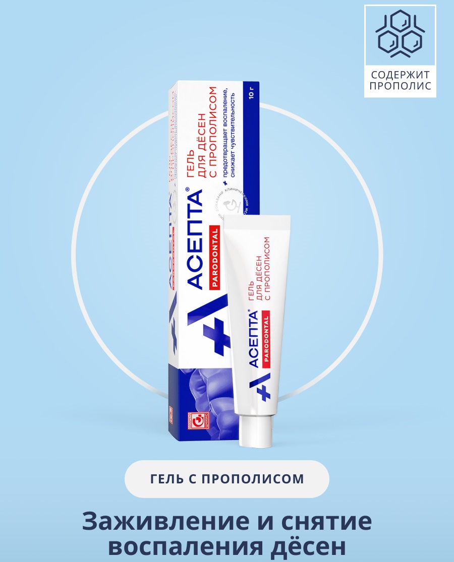 Гель легко наносится и быстро уменьшает болевые ощущения на пораженных участках, снижает повышенную чувствительность зубов, предотвращает воспаление и кровоточивость десен, а также ускоряет процессы регенерации тканей пародонта. Гель с прополисом Асепта разработан специалистами фармацевтической компании, его эффективность и безопасность подтверждены клиническими исследованиями в Центральном научно-исследовательском институте стоматологии и челюстно-лицевой хирургии.
