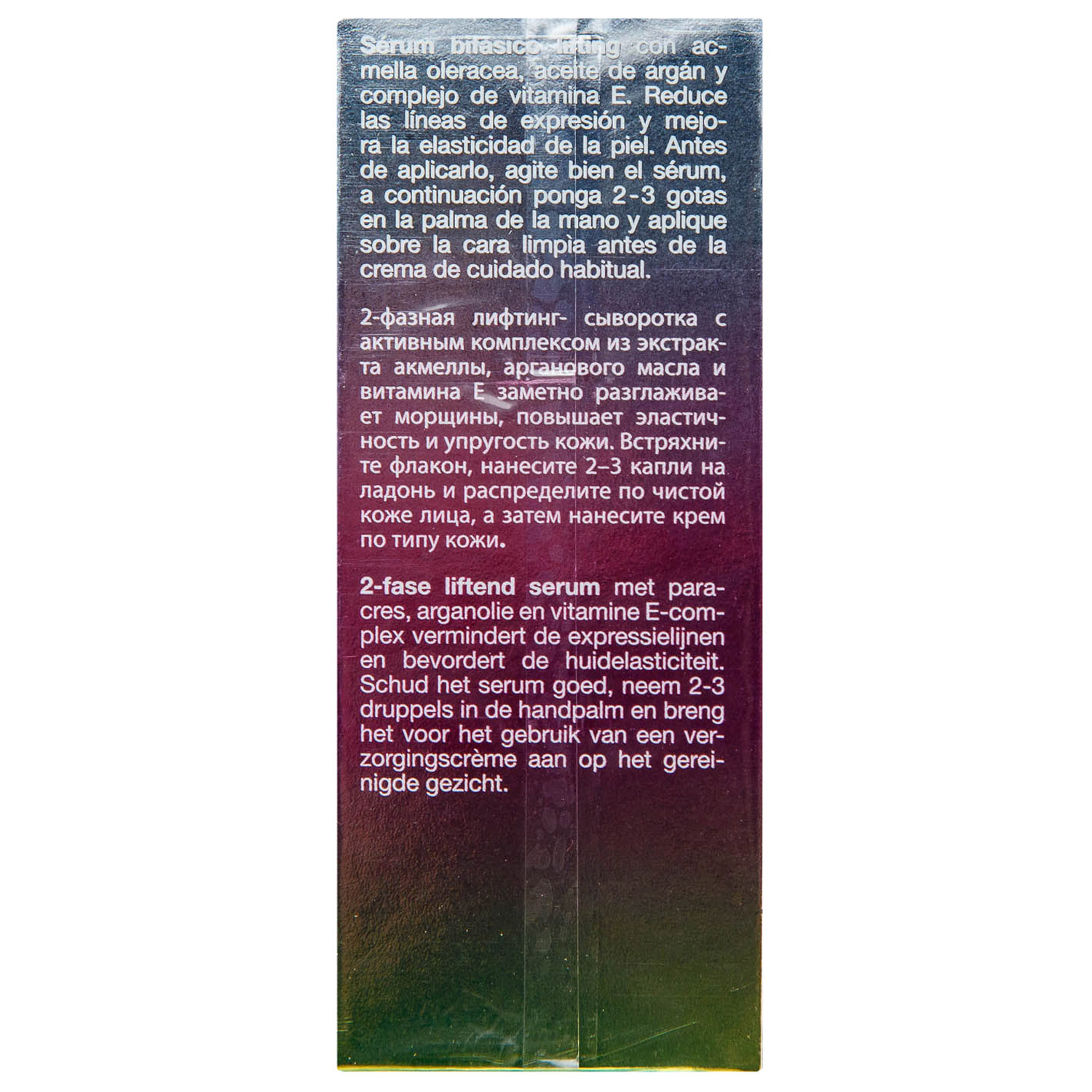 Двухфазная лифтинг-сыворотка уменьшает мимические морщины и повышает эластичность кожи. В состав включены эффективные антивозрастные ингредиенты, благодаря которым сыворотка разглаживает мимические морщины и морщины обезвоженности. Деликатно ухаживает за кожей, делая ее заметно более гладкой и эластичной. Предупреждает процессы старения, нейтрализуя свободные радикалы, и возвращает коже свежесть и сияние.