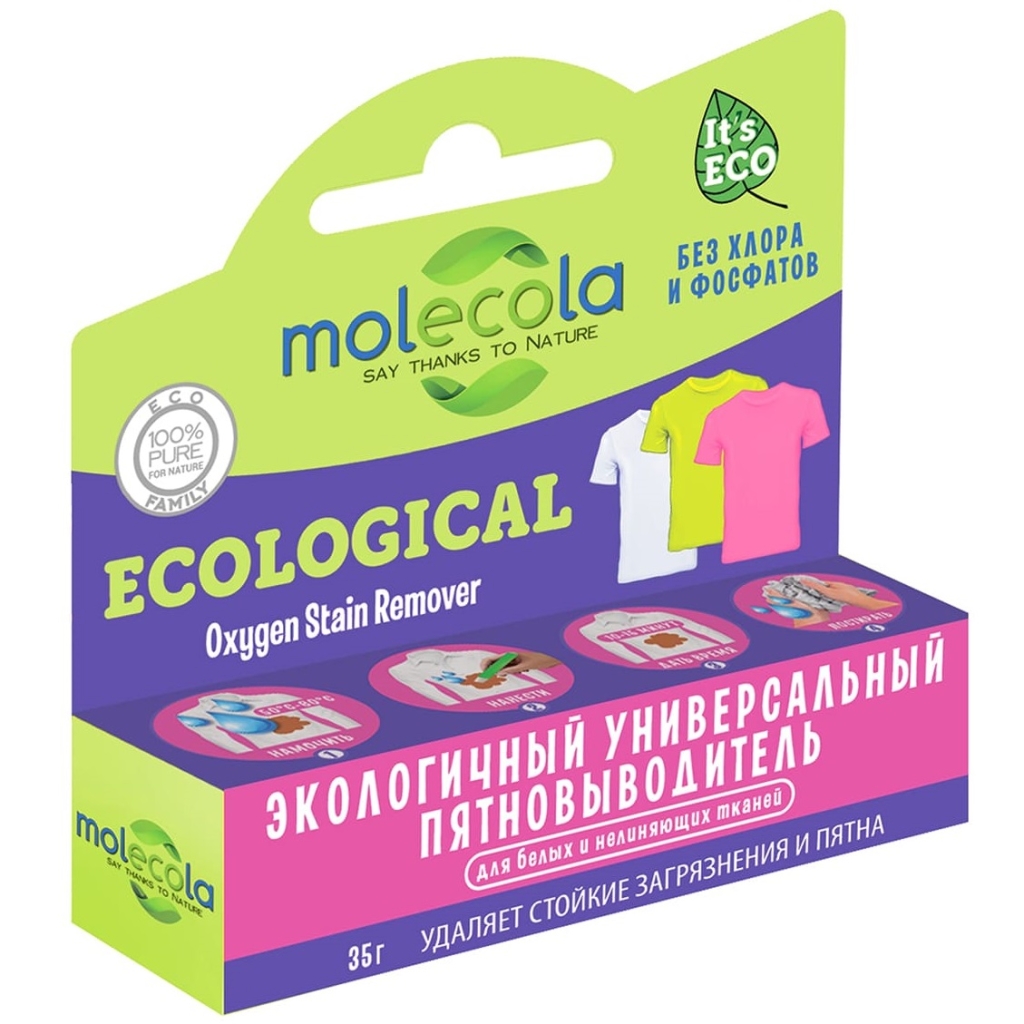 Экологичный пятновыводитель на основе кислорода эффективно удаляет трудно-выводимые пятна пищевого, природного и химического происхождения с различных видов поверхностей (одежды, текстильных элементов обуви, тканевых покрытий мебели и автомобильных кресел, аксессуаров из натуральных и искусственных материалов). Не повреждает волокна тканей и не разрушает структуру очищаемых поверхностей.