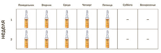 Применять каждый день в течение 5 дней подряд (например, первые 5 дней недели), затем перерыв – 2 дня.