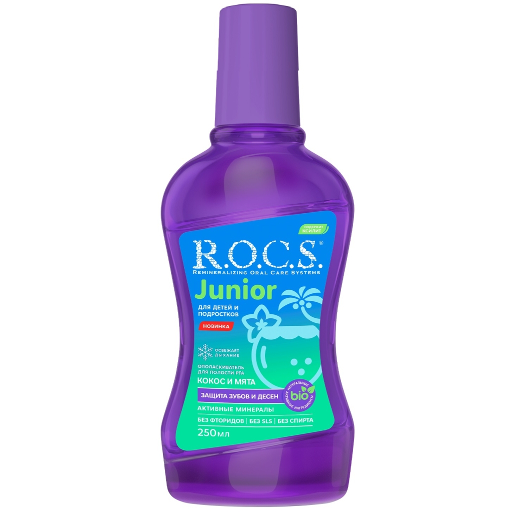 Ополаскиватель для полости рта R.O.C.S. Junior для детей и подростков со вкусом кокоса и мяты является биодоступным источником кальция и фосфора для реминерализации молодой эмали.