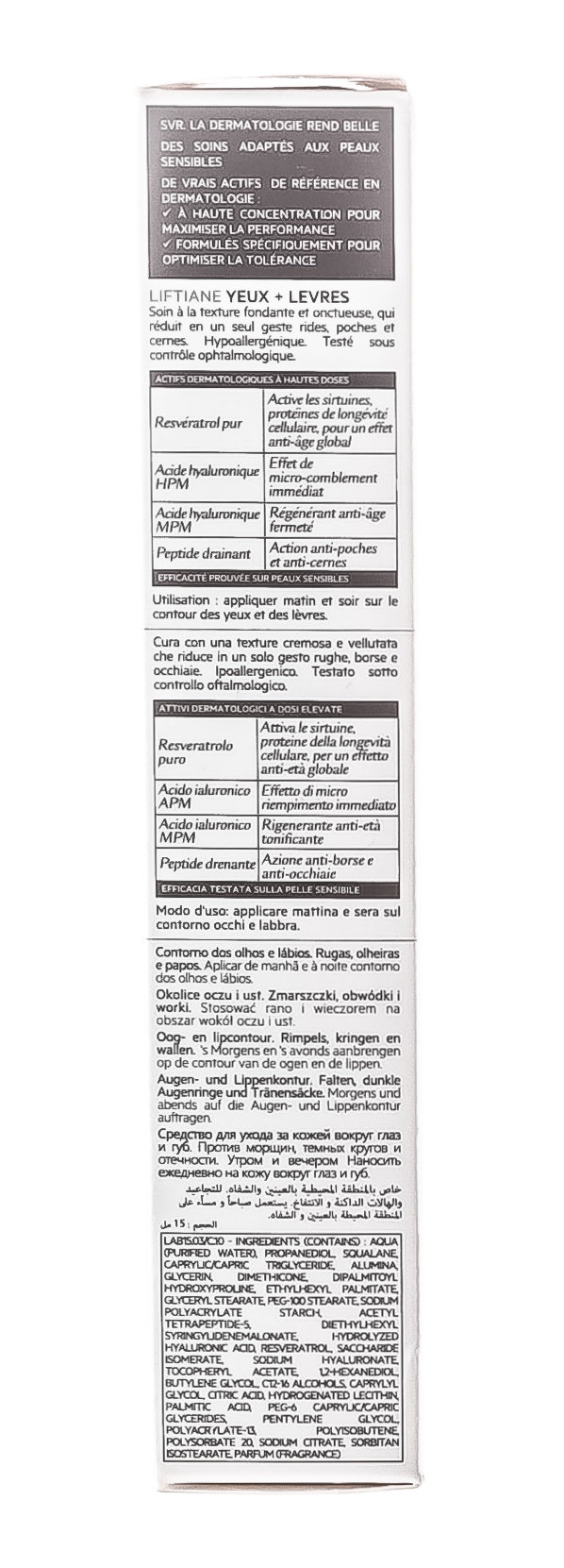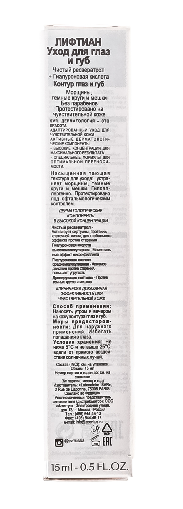 Наличие фильтров SPF 20 позволяет предупредить фотостарение кожи и появление гиперпигментации. Средство имеет нежную текстуру, легко наносится, быстро впитывается и не скатывается в течении дня. Безопасность применения косметического продукта для сухой, чувствительной и очень чувствительной кожи области глаз подтверждена в ходе дерматологических и офтальмологических испытаний.