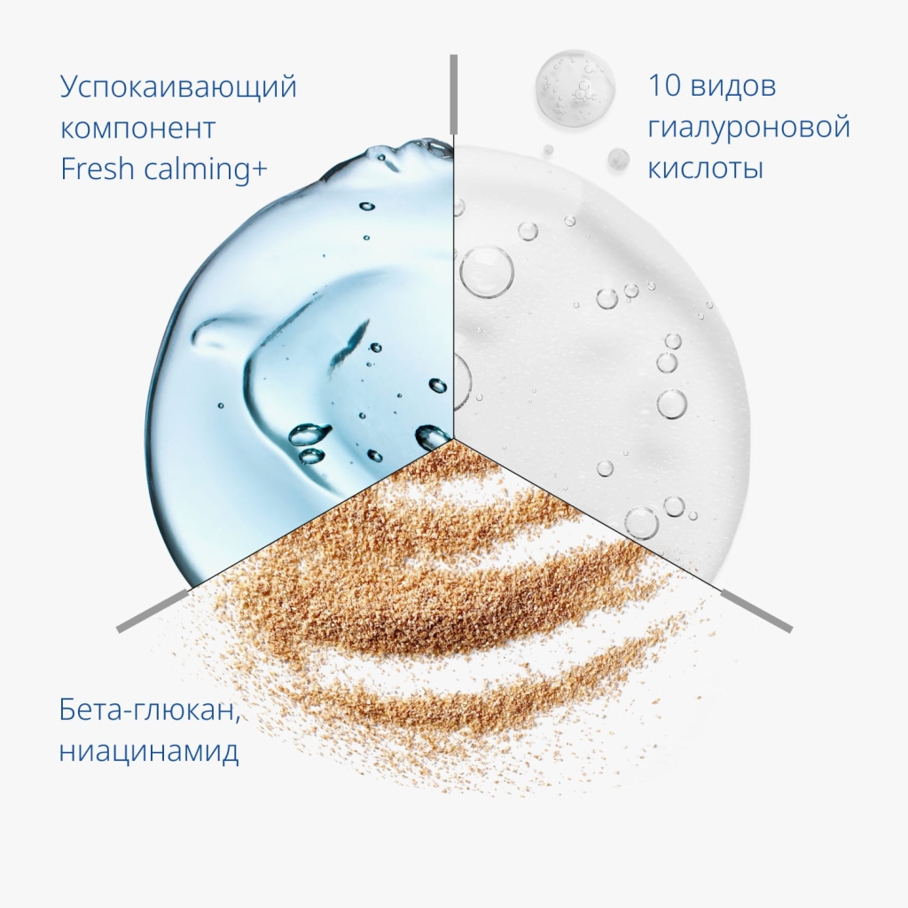 Легкая, водная, нелипкая текстура сыворотки быстро впитывается, обеспечивая глубокое увлажнение до 10 слоев кожи. Содержит ниацинамид и запатентованный успокаивающий компонент Fresh calming+, а также Бета-глюкан как мощное противовоспалительное средство. Успокаивает раздражение кожи, вызванное высокой температурой, за 3 секунды.