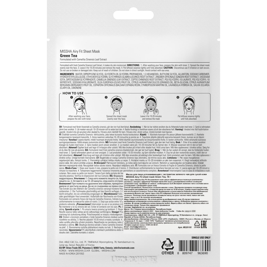 Маска Airy Fit Sheet Mask Green Tea с экстрактом зеленого чая препятствует возникновению высыпаний. Проникая в глубокие слои эпидермиса, регулирует выработку кожного сала. Эффективно увлажняет, устраняет шелушения, а так же матирует и стягивает поры. Проверено дерматологами.