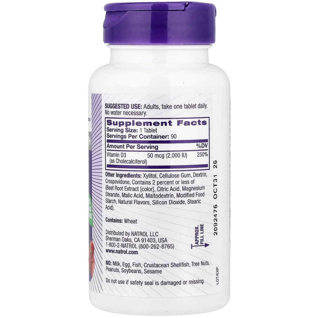 Состав: ксилит (подсластитель), витамин D3 (холекальциферол, целлюлозная камедь (загуститель), ПВП (Полиплаздон Кросповидон) (для быстрого распада), натуральный ароматизатор клубники (содержит мальтодекстрин и иодифицированный пищевой крахмал), порошок корня свеклы, диоксид кремния (антислеживающий агент), регулятор кислотности яблочная кислота, стеариновая кислота (эмульгатор), стеарат магния (эмульгатор), регулятор кислотности лимонная кислота.